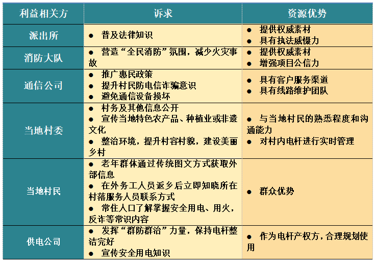 1.深挖多元訴求。向沁縣區(qū)域11個鄉(xiāng)鎮(zhèn)具有代表性的11個村發(fā)放110份“電桿新語”調(diào)查問卷,收回103份。通過收回的103份調(diào)研記錄形成初步調(diào)研方案,再通過調(diào)研方案分別同當?shù)卮逦?、派出所?5個部門單位座談交流,全面獲取各方訴求與資源(如表1)。