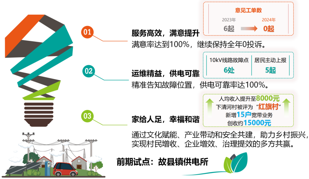 電桿文化宣傳,使居民掌握基本的安全用電、用網(wǎng)知識,電力設(shè)施外力破壞同比降低90%;學(xué)會對簡單故障的排查與處理,節(jié)約公司運維成本,如果按照平均往返15公里計算,每次可以節(jié)約油費11.25元。項目實施以后,該地區(qū)10千伏線路6處故障點,有5起為居民主動上報,并精準告知網(wǎng)格經(jīng)理故障位置,縮短尋找時間,節(jié)約費用約3500元左右,2024年供電可靠率達到100%。通信公司通過宣傳減少線路私拉亂接率70%,網(wǎng)絡(luò)故障率同比下降30%,節(jié)約費用約9000元,在該村新增15戶寬帶業(yè)務(wù)辦理,增加約15000元營業(yè)收入。