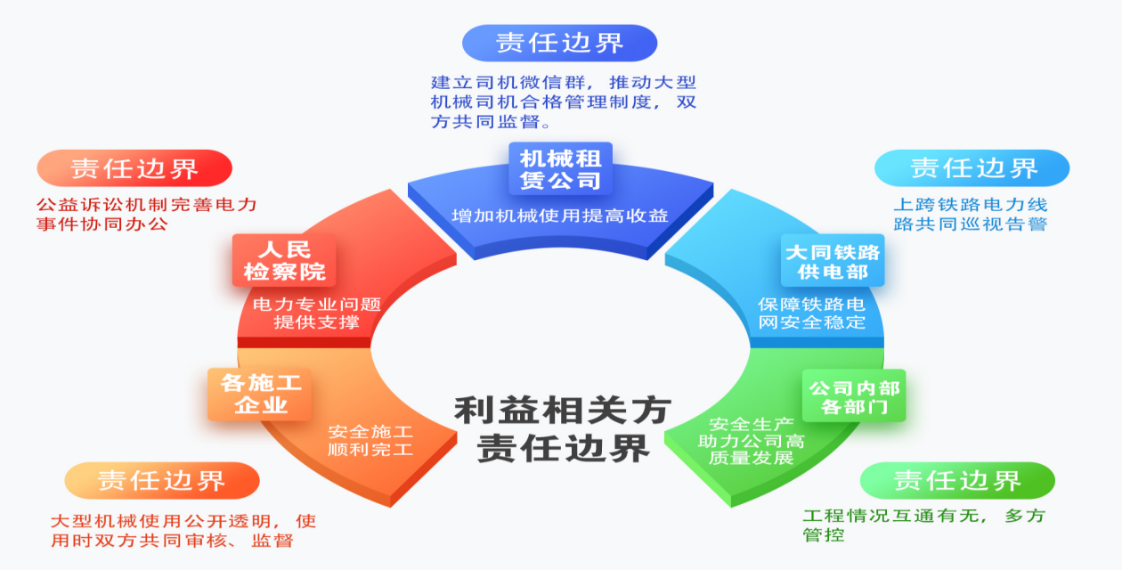 針對利益相關(guān)方的“五力”優(yōu)勢(組織力、決策力、監(jiān)督力、協(xié)作力、影響力),明確核心訴求和責(zé)任邊界,建立大型機(jī)械司機(jī)合格管理、臨時(shí)施工備案信息共享、施工固定點(diǎn)蹲守防護(hù)、鐵路安全互保協(xié)議、檢察院公益訴訟等多維度輸電線路防外破治理體系。