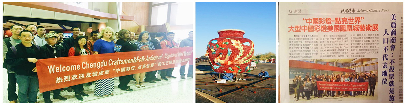 (菲尼克斯當?shù)厝A僑及美國友人歡迎燈貿(mào)集團工作人員的到來) (彩燈燈組現(xiàn)場安裝工作正在進行) (當?shù)孛襟w對本次燈展進行相關報道)