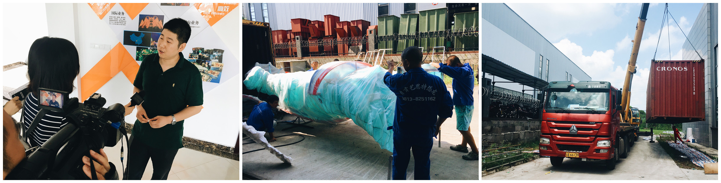 (自貢電視臺記者對自貢市燈貿(mào)集團股份有限公司國韻公司總經(jīng)理李斌進行采訪) (工作人員對彩燈進行裝箱) (運輸車正在裝載集裝箱)