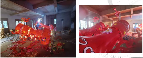 現(xiàn)場(chǎng)大多數(shù)的花燈還在按流程趕制中,也有一些已成型了。已經(jīng)制作好的打鼓你能看出是哪一個(gè)花燈造型的嗎?
