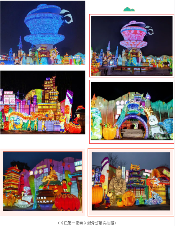 今年,自貢·中華彩燈大世界以“觀自貢燈 過中國(guó)年”為主題,550畝展區(qū)、十五大主題、上百組彩燈,給游客們帶來一場(chǎng)自貢彩燈文創(chuàng)新紀(jì)元的視覺盛宴。有800多年歷史的自貢燈會(huì),開啟全新云時(shí)代,將自貢燈會(huì)打造成展現(xiàn)時(shí)代風(fēng)貌的大舞臺(tái),讓您足不出戶也能領(lǐng)略“天下第一燈”的魅力!由燈貿(mào)集團(tuán)創(chuàng)意、設(shè)計(jì)團(tuán)隊(duì)等數(shù)百名彩燈匠人歷時(shí)兩個(gè)多月精心打造的《巴蜀一家親》、《自貢記憶》、《五糧液》三個(gè)大型燈組?!栋褪褚患矣H》薈萃川渝各城風(fēng)貌之靈光,主體以獨(dú)具特色的川渝茶文化代表——蓋碗茶為載體,現(xiàn)代透光材質(zhì)制作憨態(tài)可掬的熊貓,下方高鐵環(huán)繞而行,輔以巴蜀特色元素,將自貢傳統(tǒng)彩燈制作工藝與新技術(shù)相結(jié)合,為游客帶來可看、可聽、可聞的沉浸式的觀燈體驗(yàn)。