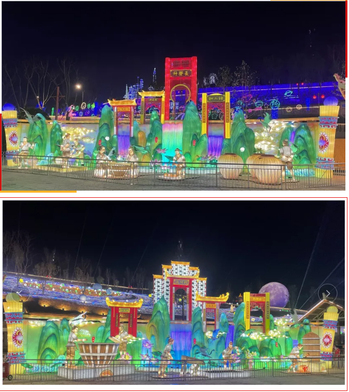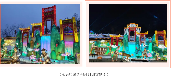 《五糧液》主燈組采用第八代五糧液酒瓶運(yùn)用自貢彩燈傳統(tǒng)工藝?yán)υ删扌臀寮Z液,輔以仙山、仙境、巨龍騰越氛圍闡釋五糧傳奇,杯酒時(shí)光,百年味道。周邊群燈組展示封存在時(shí)光中的“活窖池”--利川永、張萬和、劉鼎興、天賜福、聽月樓、全恒昌等八家明代釀酒作坊,歷史悠久的古窖池群講述著傳承幾百年的五糧液釀酒工藝,折射幾千年氤氳酒香的中國(guó)酒歷史和酒文化。
