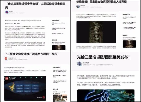 截至5月29日10點,各大主流媒體紛紛推出《光繪三星堆 攝影圖集絕美發(fā)布!》《揭開古蜀國神秘面紗 走進(jìn)三星堆體驗博物館奇妙夜》《新出土千余件重要文物后 三星堆吸引中外媒體讀懂中華文明》《三星堆國寶文物銅頂尊跪坐人像亮相!》《“三星堆文化全球推廣戰(zhàn)略合作”9大項目正式發(fā)布》等新聞報道。