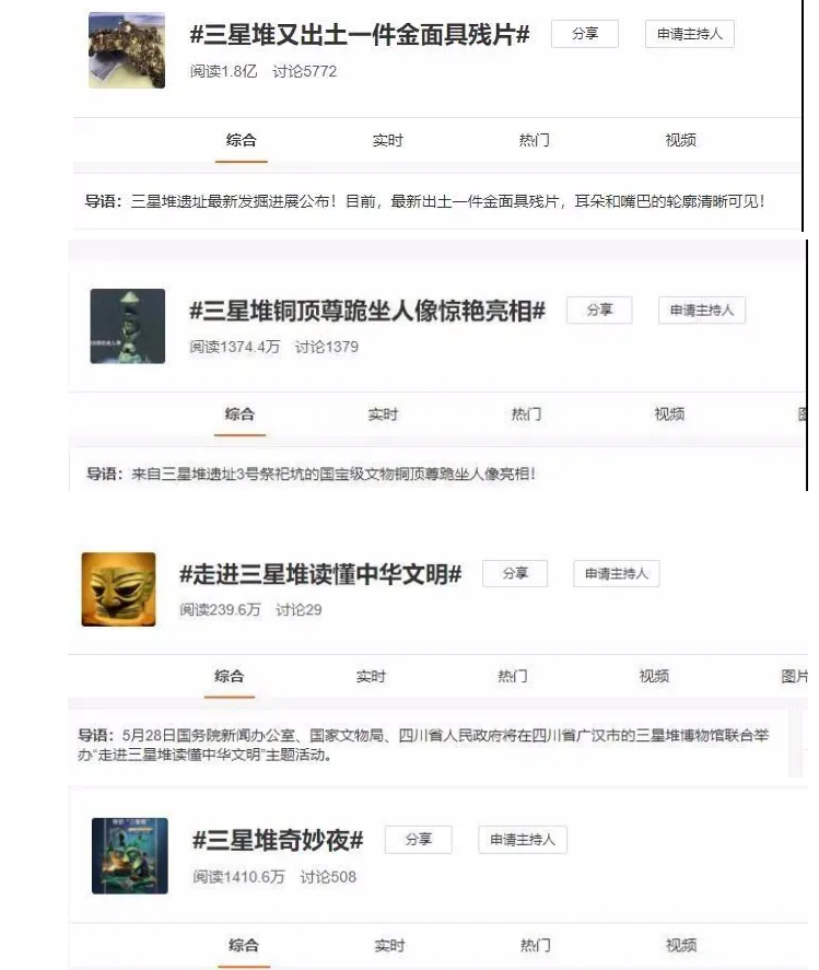 新浪微博話題 #三星堆又出土一件金面具殘片##三星堆銅頂尊跪坐人像驚艷亮相# #走進(jìn)三星堆讀懂中華文明##三星堆奇妙夜##三星堆奇妙夜直播#等相關(guān)話題累計閱讀量都很高!