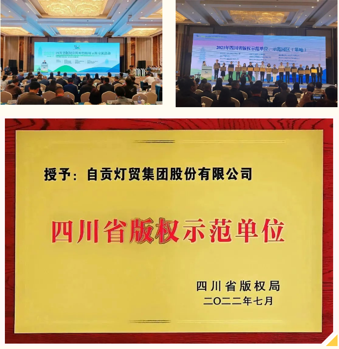 在第23個世界知識產權日來臨之際,由中國版權協(xié)會、四川省委宣傳部版權局主辦,綿陽市委宣傳部承辦的“四川省2023版權宣傳周暨版權示范交流活動”于2023年4月25日在綿陽舉行,活動以“推動版權創(chuàng)新創(chuàng)造 助力文化自信自強”為主題,以線上線下聯(lián)動方式同步推出。活動當天,省版權局為2021至2022國家級、省級版權示范單位和示范園區(qū)(基地)授牌。自貢燈貿集團股份有限公司參加了活動,并獲頒“四川省版權示范單位”榮譽稱號。